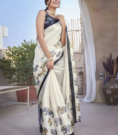 Printed Daily Wear Art Silk Saree (White, Black)