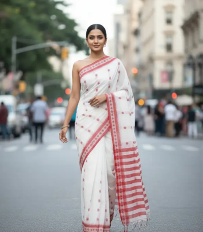 Woven Handloom Cotton Blend Saree (White, Red)