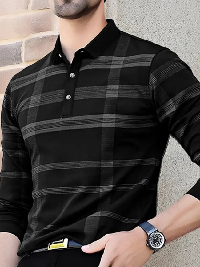 Men Striped Polo Neck Cotton Blend Black T-Shirt