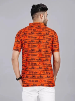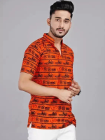 Men Typography Mandarin Collar Cotton Blend Orange T-Shirt