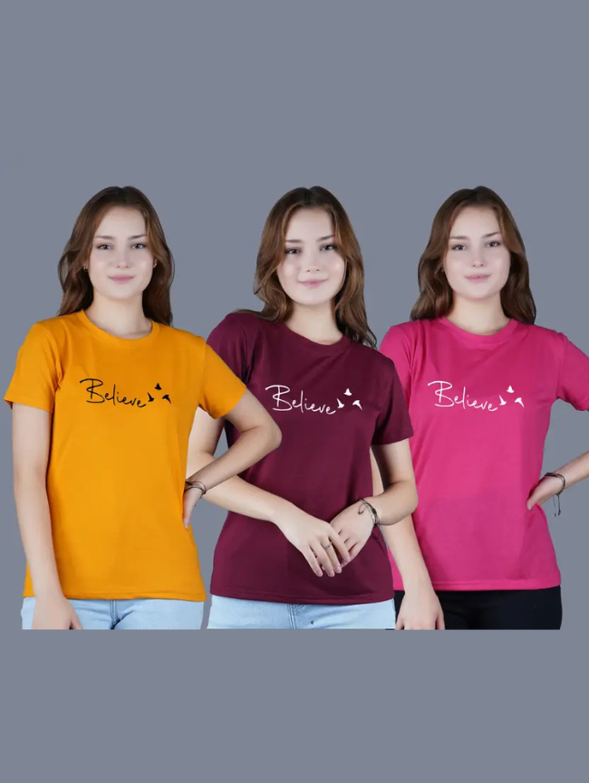 Pack of 3 Women Printed Round Neck Cotton Blend Multicolor T-Shirt