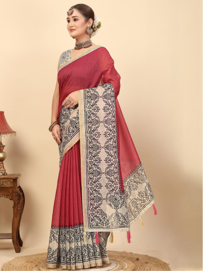 Pink Printed Bollywood Chanderi Saree comes with a unsticthed blouse piece The saree comes with an unstitched blouse piece The blouse worn by the model might be for modelling purpose only. Check the image of the blouse piece to understand how the actual blouse piece looks like.