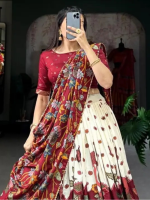 Printed Semi Stitched Lehenga Choli (White, Red)