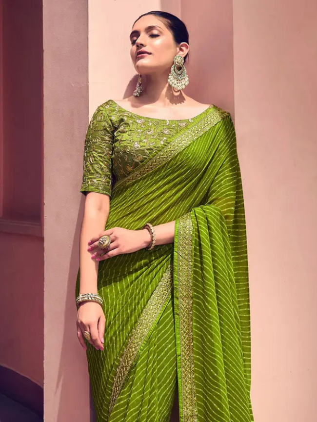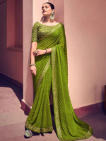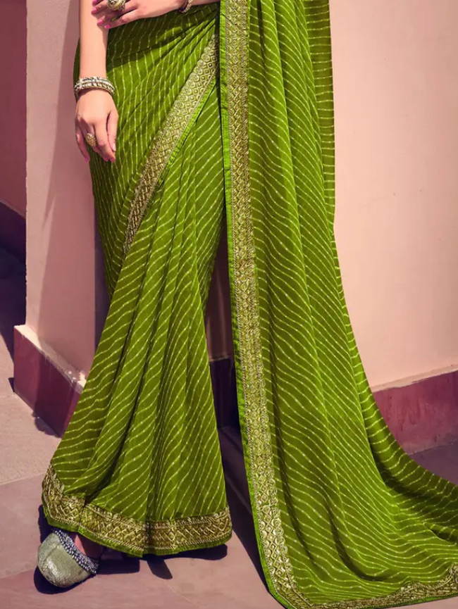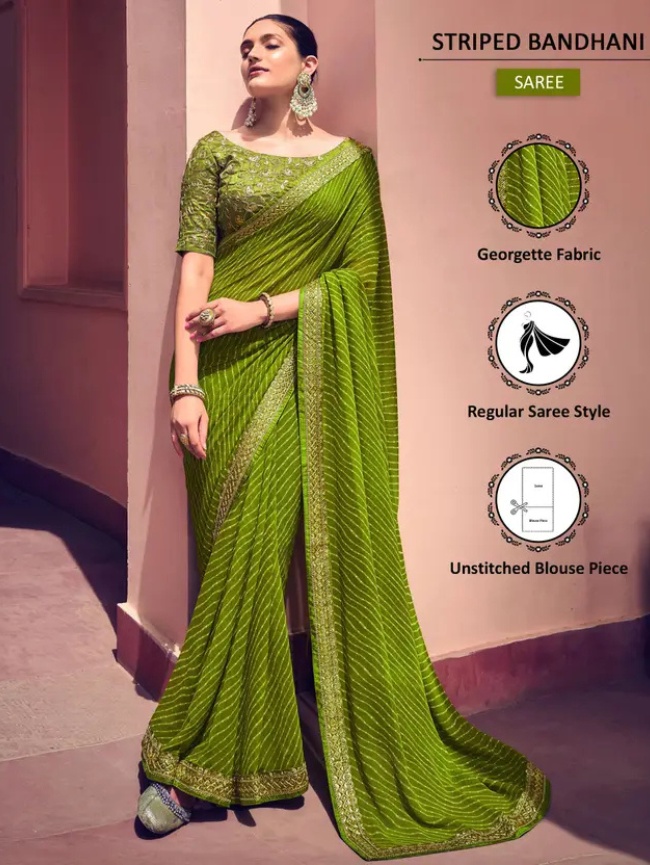 Striped, Embellished Bandhani Georgette Saree (Green, Gold)