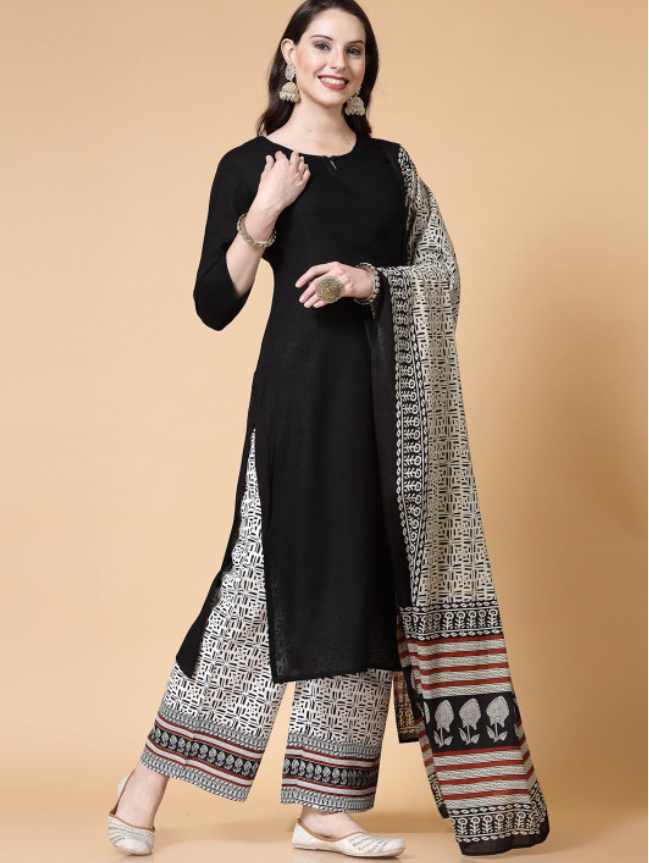 Black self design Kurta with Palazzos with dupatta Kurta design: