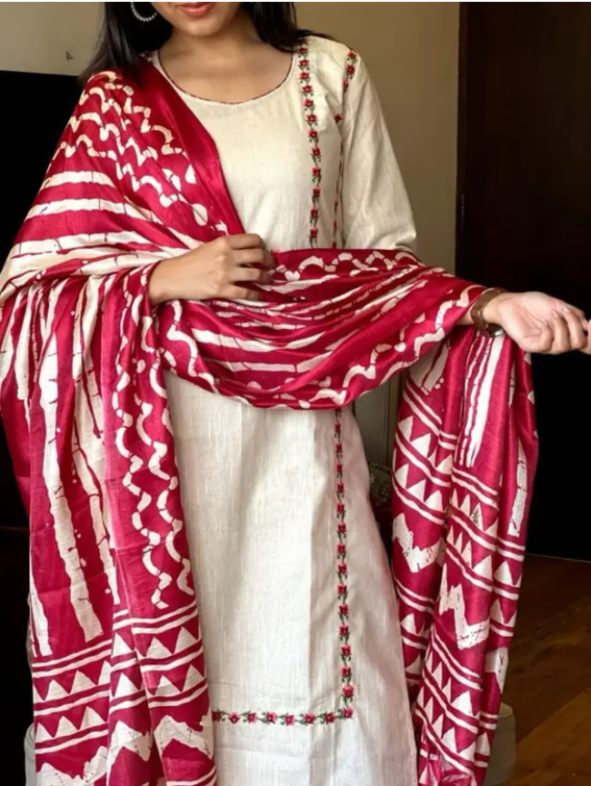 Women Khadi Cotton Kurti Pant Dupatta Set