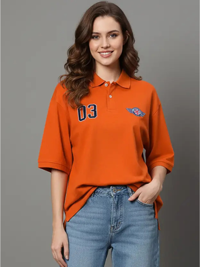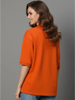 Women Solid Polo Neck Cotton Blend Orange T-Shirt
