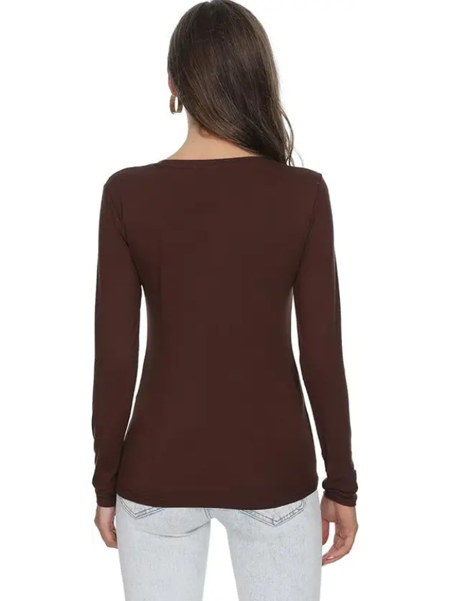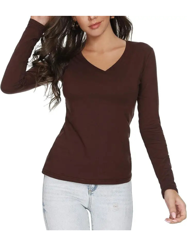 Women Solid V Neck Cotton Blend Brown T-Shirt
